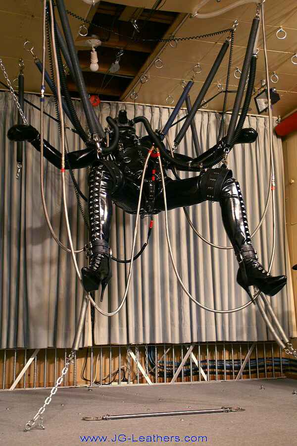 It was time to get serious and after being re-collared, she fitted me with the urethral electrode version of the end cap, ensuring that the full length of the intrusive shaft penetrated me fully. It doesn't hurt to do the insertion, but when someone else does it, then the whole scene dynamic changes dramatically. I climbed onto the stool and began to get hooked up to the suspending springs. Connecting the springs to my harness went speedily, then I waited for the next part of the bondage process to be enacted. Already knowing a little of the depth of Mistress Marlene's cruel streak, I was beginning to get more than a little nervous about what was soon to come. The vacuum hoses and e-stim cables were rapidly connected to my breast cups, butt plug and penile tube, then came the wide thigh cuffs. She then brought over the first gas mask I was to wear and I fitted it to my head and face, ensuring an air tight seal. We tried another, just to ensure that all would work, then it was back to the first one, and this time it was locked on. It was time to get fully positioned ... this time, laying on my back, fully-suspended and with legs held wide-spread, adding incredibly to my sensations of helplessness and vulnerability, even though ... for the moment ... I could still escape the bondage. THAT was soon to change! I was getting closer and closer to the point of no return when Mistress Marlene lifted my thighs and hooked on their suspension springs then fitted me with thick, black rubber gloves. To ensure that I had no chance of getting at any of my fastenings, my hands were slid into tight, heavily-padded rubber isolation mitts, rendering my already tightly gloved fingers and hands utterly useless. There was no no possible way to escape just by my own efforts. The gloves' long gauntlets were sealed away under the zipped closed arms of the rubber suit, then snugly-closed hand cuffs ensured that the zippers could not be opened. Ceiling-mounted chains were connected to my wrist cuffs so that my hands and arms were held off to the sides, thus making sure that I was unable to get them anywhere near my body, then she walked around, carefully inspecting the entire arrangement. By this point I was already panting with nervousness, but could only hang there in mid-air before her and wait with mushrooming fear and anticipation of what was soon to come. Fastened as I was, I did not see her move to the Control Panel, but very soon knew she was beginning her 'therapy'! Small, shuddering and pulsing shocks began to convulse and needle through my nipples and breasts. I'll try below to give some idea of what it felt like on them,with colours denoting increasing intensity ... Bbbuuzzz-bbbuuzzz-buuzzzzzz!!! ZZZZIIPP-ZZZZIIPP-ZZZAAPPP! Bbbuuzzz-bbbuuzzz-buuzzzzz!!! ZZZZIIPP-ZZZZIIPP-ZZZAAPPP! Bbuuzzz-bbbuuzzz-buuzzzzz!!! ZZZZIIPP-ZZZZIIPP-ZZZAAPPP! Bbbuuzzz-bbbuuuzzz-buuzzzz!!! ZZZZIIPP-ZZZZIIPP-ZZZAAPPP! and on and on and on! ... The electro-shock didn't stop, although she occasionally turned it down for a few seconds before bringing the power levels to higher and higher settings! Mistress Marlene had just begun though for the penile tube electrics and butt plug hadn't escaped her attention and soon I felt the e-stim beginning down there. I gasped at first then began to yell from her remote disciplining, thrashing frantically against the restricting and suspending springs, but she kept gradually increasing the strength of the pulses until I was nearly screaming ... Zzzzzziipppp! BBbbbuuuuzzzz-ZZZZZZIIIIIPPPPPP ZZZAAAPPPP! Zzzzzziipppp! BBbbbuuuuzzzz-ZZZZZZIIIIIPPPPPP ZZZAAAPPPP! Zzzzzziipppp! BBbbbuuuuzzzz-ZZZZZZIIIIIPPPPPP ZZZAAAPPPP! Zzzzzziipppp! BBbbbuuuuzzzz-ZZZZZZIIIIIPPPPPP ZZZAAAPPPP! Zzzzzziipppp! BBbbbuuuuzzzz-ZZZZZZIIIIIPPPPPP ZZZAAAPPPP! The sensations she forced me to experience were indescribable!! My reactions couldn't be helped for over the next minutes, the sets of shocks to both my breasts and crotch electrics grew stronger and stronger, making me twist and writhe in distress in mid-air. I was unable to stop the yelps then howls they made me utter, but there was no escaping them, nor did she cease her experimentation, but just smiled happily and continued adjusting the power upward. No matter how hard I pulled on the springs in desperate attempts to get at the cups and crotch plate of the tormenting harness, I could get nowhere near them and only succeeded in bouncing wildly in mid-air. Mistress Marlene quelled my rebellion with sharp and sudden increases of shocks, and still shuddering from their strength, I tried to settle down. This was just the beginning phase though! The shocks slowly died back to a level that I could handle without too much in the way of physical reaction and I was left to percolate slowly for a few minutes. Far too soon she turned on the first vacuum pump and I immediately felt an extremely strong vacuum begin to suck both the breast cups strongly onto my chest in a slightly oscillating manner that came close to releasing the cup's leech-like attachment... SSSuuuuccckkk-SSSuuuuccckkk-SSSuuuuccckkk-SSSuuuuccckkk-SSSuuuuccckkk-SSSuuuuccckkk-SSSuuuuccckkk-SSSuuuuccckkk-SSSuuuuccckkk-SSSuuuuccckkk ... it didn't stop for a second! Suddenly, the vacuum came on the penile tube and I felt it instantly engulf me, then begin sucking on the only moveable part, the shaft of supremely sensitized flesh it contained! I gasped from the sensation when tube sealed itself onto my belly under the crotch piece and rubber suit, driving the urethral sound fully into me! It couldn't be escaped! I was pulled inexorably further and further along the awful tube, becoming more and more impaled. I'd almost forgotten the low level e-stim. She had not. Mistress Marlene's attention returned to the e-stim part of the Control Panel, now that she was assured by my movements that the vacuum was functioning as she wanted it to, and she began once more to adjust the controls: changing stimulation patterns and
