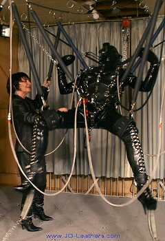 ****************************** JG-LEATHERS - ARTICLES - PAGE FORTY-FOUR - Play With Mistress Marlene: 10 July, 2008 *********************************** - 10th February, 2009 - Over the past year, Mistress Marlene and I have been slowly exploring the capabilities of The Creature and how she can make it do what she wants it to. It's been an interesting experience for us both, needless to say! Mistress Marlene is not a gear head, but is intrigued with the manner in which technology (i.e. The Creature and all of its associated equipment) can be employed to heighten and enhance a sensory experience, as well as to control and subjugate the person imprisoned within it. I, being the person I am, and having created it for my own 'entertainment', want to experience TC's capabilities as frequently as can be managed, but those times are rare, unfortunately. However, we have plans for further explorations with TC in various configurations and situations and then we'll get down to some pretty seriously-intentioned play, but that may not be recorded, and if it is, may not be made public. We set up a photo and video session for the 10 July, 2008. Rubbert (my tech support guy and still photographer) came over from The Island with Mistress Marlene and her videographer friend Christian and away we went after first sitting down and going over the plans for the day.