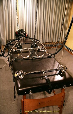 ******************************* JG-LEATHERS - ARTICLES - PAGE FIFTY-FOUR - Latowski Chastity Belt, Mistress Marlene & Bondage Bed ******************************* (ALL PHOTOGRAPHS TAKEN BY RUBBERT) - Play Done in June, 2010: Uploaded - 20th February 2015 - It takes me years to accumulate all of the kit needed to do a photo-shoot as seen in the pictures that follow, and that's due to the cost. The AXSMAR cuffs were purchased quite a while ago and the other pieces came along in dribs and drabs. Some of the restraints I've made myself, but things like the gas masks, the rubber cat suit, and the bastardized Massage Table needed to be bought. Why re-invent the wheel? - Setting the Scene & The Equipment -