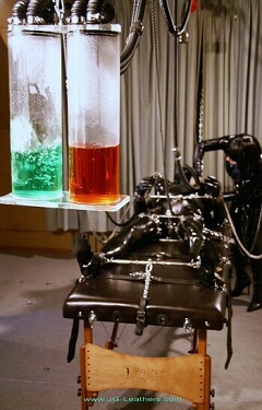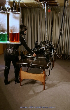 Although I could breath easily, my air supply was routed through the Bubbler Columns. These create just enough resistance to normal breathing that it soon became an onerous chore to make each and every inhalation, thus adding even more to the whole process of subjugation. I could still move my lower arms relatively freely, but this situation was soon remedied with the addition of further chains to the wrist cuffs, these acting to hold the wrist separator bar down tightly against the front of the crotch cover of my chastity belt and thus preventing any unauthorised thrashing around. Total bondage was the idea and she executed it with great thoroughness - Stimulation & Torment - Although it seemed like a long time later, the sensations of the intimate e-stim soon began to torment me under the securely locked-on chastity belt, but SHE was just at the beginning of the dance! I felt a slow pulsing of the e-stim through my lower body and at first it was bearable, but the levels slowly and irresistibly kept getting higher and higher, soon making my hips lift and buck automatically against the straps holding me down. Inside the mask I gasped and yelled more and more loudly as the pulses were gradually increased in strength: music to her ears. No matter how I struggled, the electrical energy continued to wash over and through me! Then I attempted to kick and jerk my legs against their multiple cuffs, desperate to try and (uselessly) close them against the intimate assaults and somehow try to escape the by now terrifying and agonizingly persistent e-stim coursing through my body, under the locked-on chastity belt. Of course, the bondage set-up I'd created is purpose-designed to prevent ANY sort of resistance or evasion and it worked to perfection.