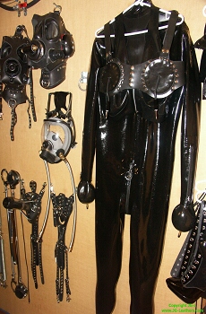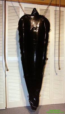 Today was also another 'play day' for me, with one more session in the sleep sack, followed by rubber enclosure with TC harnessing over the top, then suspension, full e-stim and vacuum. Needless to say I was a tad fried after the unavoidable gymnastics :-). Here's a couple of 'teaser' pix, and there'll be an article with more and perhaps a video clip, to come in the next couple of days.