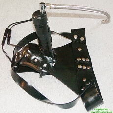 When the time comes for my 'ride' in the Sleep Sack, everything will be topped off with; first, an open-faced helmet, then one with only eye nose and mouth holes, and finally by the device you see above ... the gas mask/helmet that has been adapted to function fully with the respirator. What you see above, in combination with the other helmets and ear plugs, will deafen, blind and control my breathing, being sealed in place by the cat suit's high collar, a neck corset and the collar of the Sleep Sack itself.