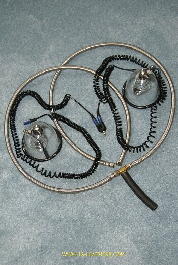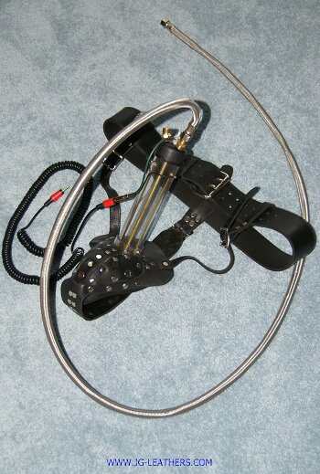 Above are the clear acrylic, vacuum/electrical breast cups, shown with their connecting hoses and cabling