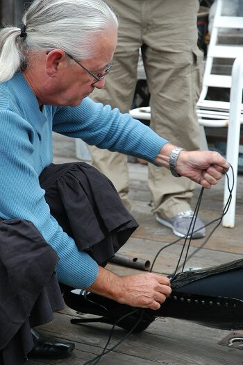 Left above ... me lacing up a lady's ballet toed knee boot - always a fun thing, and then on the right, another of Mark's newest devices ... a mobile restraint chair, with the frame made from Uni-Strut.