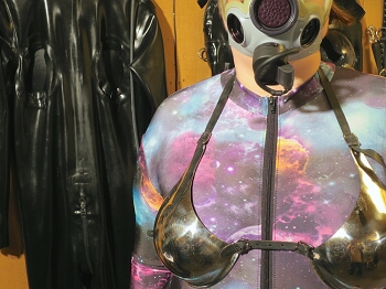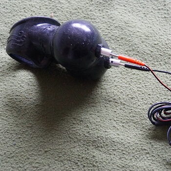 ABOVE LEFT: An electrifiable chastity cage called PUBLIC ENEMY NUMBER ONE used for training and correction of the wearer.  ABOVE RIGHT: A neoprene rubber scrotal sack with electrical 'encouragement' capability.
