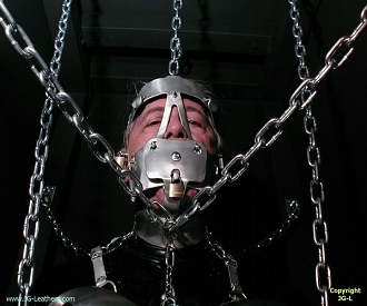 ***************************** - JG-L PHOTOGRAPHS - - PAGE NINE - PLAY TIME FOR ME: PART THREE ***************************** As you've no doubt read in other sectors of this site, I've had an abiding fascination with a character by the name of 'Sabrina' and over the years have moved towards replicating her entire restraint ensemble, as well as doing drawings of all sorts, then writing a 'biography of her exploits in her secret home dungeon. With that being sad, here's more images, showing my continuing journey of being a sensation slut. LEFT ABOVE - The combination Head Cage/Collar combination, complete with the 'normal' gag panel locked in place. RIGHT ABOVE - Back view of the Chastity Bra and the waist band of the Chastity Belt. With wrist cuffs fastened behind, the Head Cage leashed to an overhead beam and hobble chain locked to a securely mounted floor ring, there was very little freedom permitted, and escape was quite impossible. Detail images of of the ankle cuffs and how their connecting chain is connected to the floor ring. Given the top of the head leash and the manner in which my wrists are confined, there isn't a prayer of being able to undo the Kwik-link. With the Wrist Separator bar locked between my wrist cuffs, together with the restraint chains to the waist band, the complete security of confinement became even more intense, and even though I attempted to touch other parts of the restraint harness, it was almost impossible to manage. That wasn't the end of it though, for a few minutes later, I was fitted with the blinder panel. Now there was nothing to do but stand there and wait to be freed. Without sight, my balance was affected and so I wavered back and forth, only prevented from falling by the top of the head leash, and extremely limited in my radius of action. No doubt by this point, you must think me an utter idiot for getting myself into this fix. Well, all I can offer by way of excuse is to say that I HAD to give this a try (and want to do it again, for longer). The sensations and emotions experienced while in this situation are like nothing else. It was a rush, to be sure! And so, there I was, inescapably suspended in a chain web in Mark's closet/cell. Sure I could move a little in some directions, but there was absolutely no way to get out of the situation without assistance. Being under this type of control is a rush that's hard to describe to the uninitiated, but there definitely is one. Some close up shots showing the various chains and