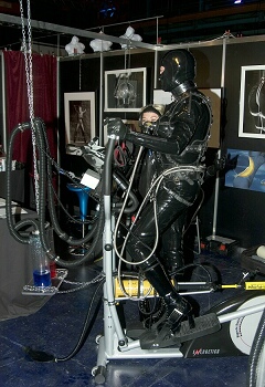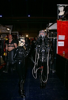 My very good friend Pupett travelled down from Duisburg to attend the show and it was really great to see her again. and then, Juergen was kind enough to let her try on the spectacular head cage he'd created for Cordula. Naturally once she was all locked in, I couldn't resist the addition of a leash and in seconds she'd been attached to some nearby ironmongery, because ... what else are friends for :-)?