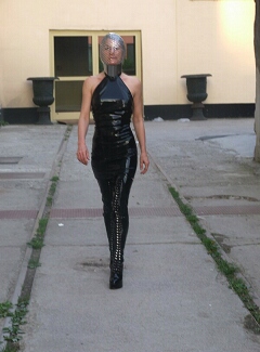 I suppose by now, it is pretty obvious that I really like Cordula and Juergen for their wonderfully kinky approach to an event like BondCon and here's another example why. Despite the heat and bright sun, Cordula was game to do an out of doors session in full rubber and the Twin Set helmet (a very oppressive and claustrophobia inducing device). She has my greatest respect.