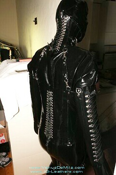 It's almost mandatory that the rubber suit be a part of the TC environment for it adds a great deal to the feelings/sensations of enclosure and isolation from the surrounding world and so that was the first thing that Venus got into.  A helmet, gloves, over-mitts and boots followed immediately, then came the AXSMAR wrist cuffs, collar, ankle cuffs and a hobble chain.