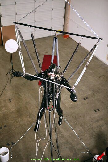 When I try to move or squirm loose, it only lays way to more extreme movement of the shaft driven deeply into my vaginal walls.  John moves the extension around with a firm grip of his hand on the 'Inhibitor Bar' and I immediately stop in mid-movement to prevent another extreme sensation.  It is now time to climb the ladder and begin the process of being connected to the heavy springs. The strong, strategically placed rings on the leather shoulder/upper body harness were carefully planned for just this moment.  With me now completely covered in rubber, John purposefully turns me to him and looks right into my eyes, then asks, "Venus are you ready to experience The Creature?" while not losing eye contact for a moment.  I respond, "Yes, Sir."  I realize my eyes are as wide as saucers and can feel the adrenalin coursing through my veins.  I am now in a hyper-observant state and taking in every movement, sound or sensation around me.