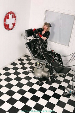 It didn't take long to have her outfitted in restraints from THE CHURCH OF SINVENTION and she was quickly strapped down on the operating room chair/table, gagged and readied for anything.