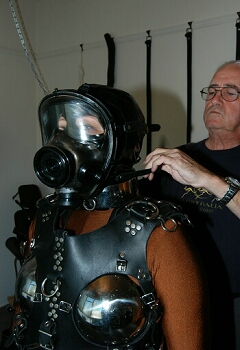 Juergen is a great inventor, amongst his many other skills and on the left you can see the guts of the Pleasure Suit's appliances.  The back pack isn't light weight, due to the batteries required.  On the right side is the newest addition to the PS ... this being the force feeding cylinder on the front of her gas mask.