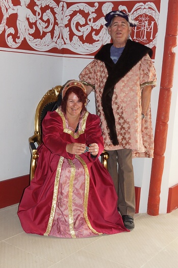 The roof truss work of the great hall that consumed multitudes of trees.  In the centre pic, I wanted to be the one sitting down in the gown, but figured it would freak out the other visitors.  On the right, one of the volunteers dressed in period costume.