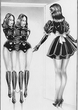 Over the years I've collected a lot of Tom's art work. His use of black and white illustrations and use of fetish imagery to show his love of rubber, bondage, enclosure, et al, for the female form is outstanding, in my view. I've purchased his books where I could find them, but feel that I should mention that all of the imagery seen below was down loaded, NOT scanned.