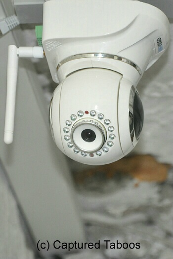 The cell is equipped with an infrared camera that relays images to the home computer and TV, and as well, before donning her cat suit, Cordula is fitted with various e-stim devices that she can, normally, control ... unless over ridden by Juergen, outside.